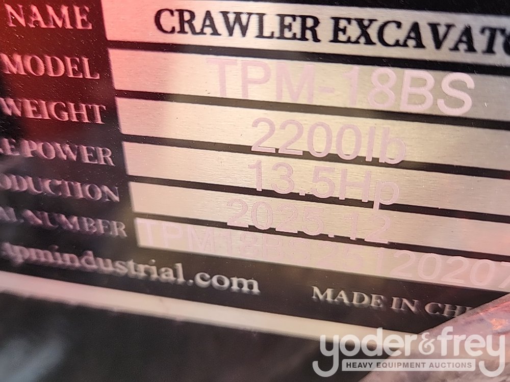 Unused TPM TPM-18BS Mini Hydraulic Excavator c/w 15" Dig Bucket, 43.3" Push Blade, 7" Rubber Tracks, Inverted Boom, Briggs & Stratton 420cc 13.5hp, Hydraulic Pilot Control System, Canopy, Heat Radiator - TPM18BS25120207