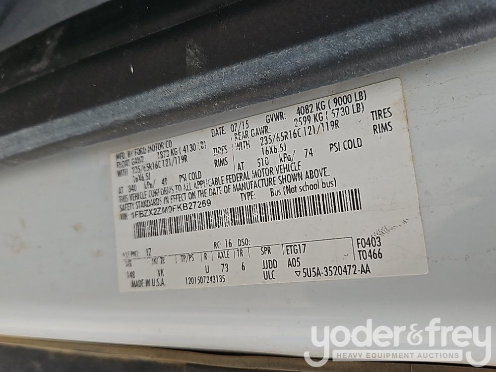 2015 Ford T350 15 Passenger Van, Gas, A/T, RWD (Meter Reading: 72973 Miles) - 1FBZX2ZM0FKB27269