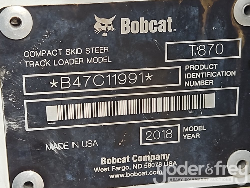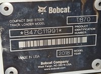 2018 Bobcat T870 Tracked Skidsteer Loader, Cab, A/C, Joystick Controls, High Flow Aux Hydraulics, Bucket (Meter Reading: 2734 Hours) - B47C11991